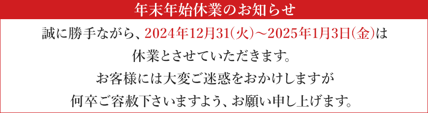 2024年12月31日(火)~2025年1月3日(金)はお休みさせていただきます。